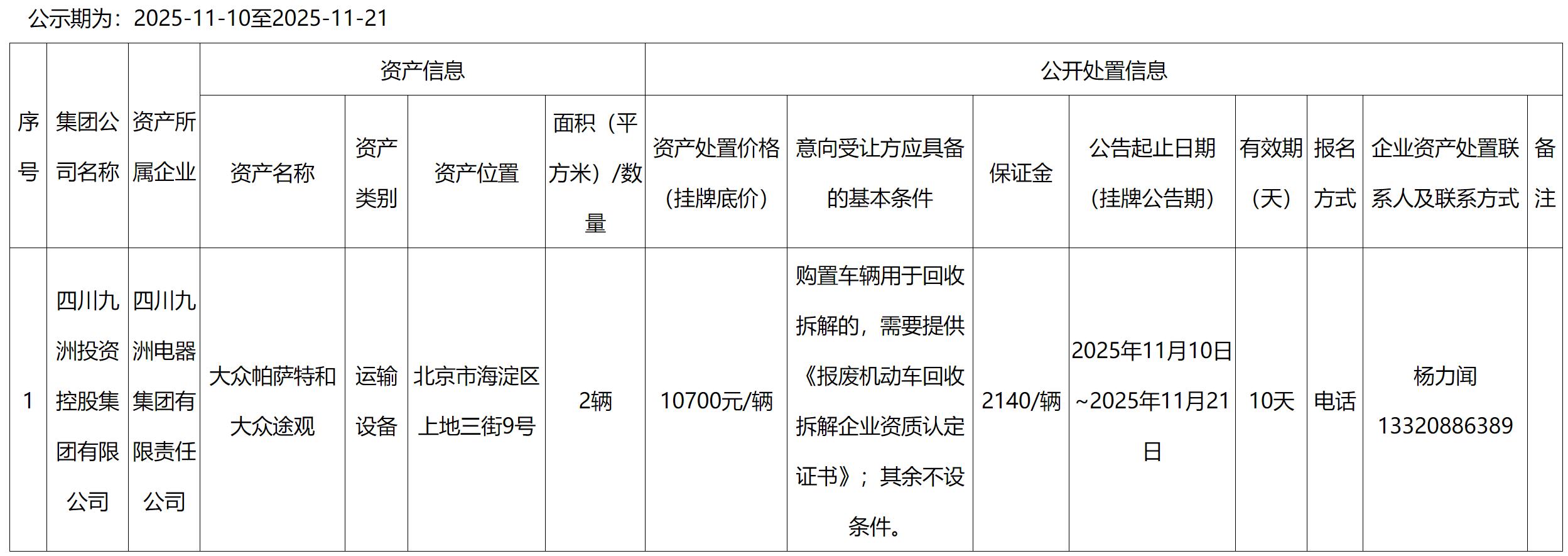 四川九洲電器集團有限責(zé)任公司資產(chǎn)處置公告