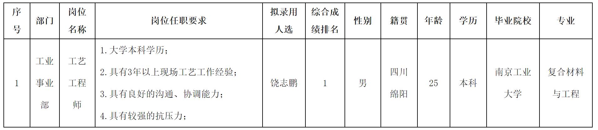 根據(jù)四川華豐科技股份有限公司發(fā)布的招聘公告及招聘相關規(guī)定,經(jīng)測試等程序,擬錄用饒志鵬同志到四川華豐科技股份有限公司工作,現(xiàn)予以公示,具體情況如下: