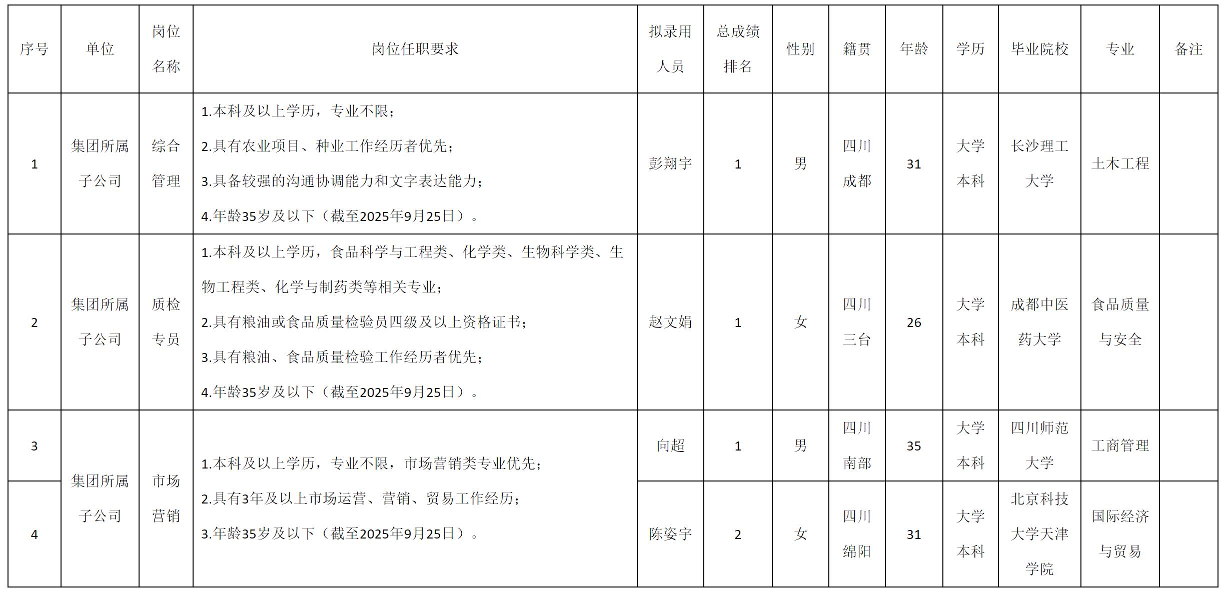 根據(jù)綿陽市糧油集團(tuán)有限公司發(fā)布的招聘公告及招聘相關(guān)規(guī)定,經(jīng)筆試、面試、背調(diào)、體檢等程序,擬錄用彭翔宇等同志到糧油集團(tuán)工作,現(xiàn)予以公示。