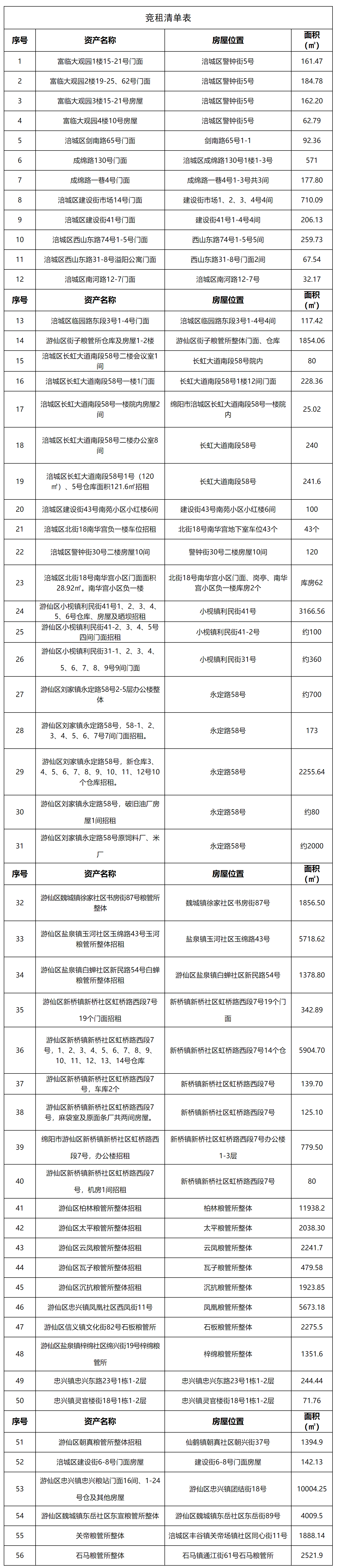 綿陽(yáng)市眾一糧油有限公司現(xiàn)有門(mén)面、倉(cāng)庫(kù)、住房及其他資產(chǎn)面向社會(huì)公開(kāi)競(jìng)租(詳見(jiàn)競(jìng)租清單)
