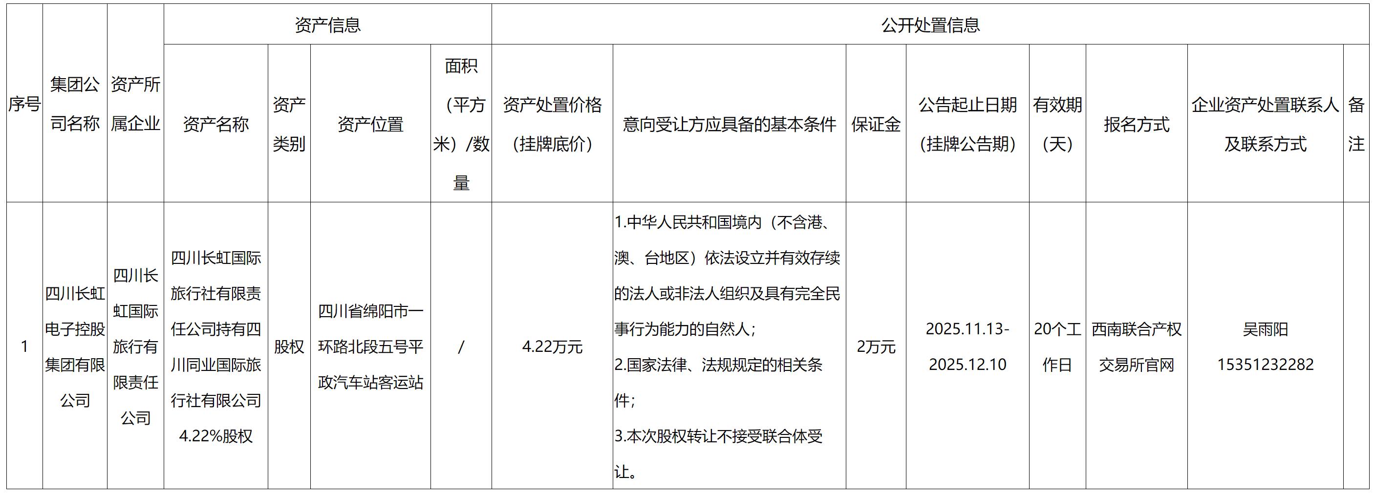 四川長(zhǎng)虹國際旅行社有限責(zé)任公司所持四川同業(yè)國際旅行社有限公司4.22%股權(quán)轉(zhuǎn)讓公告