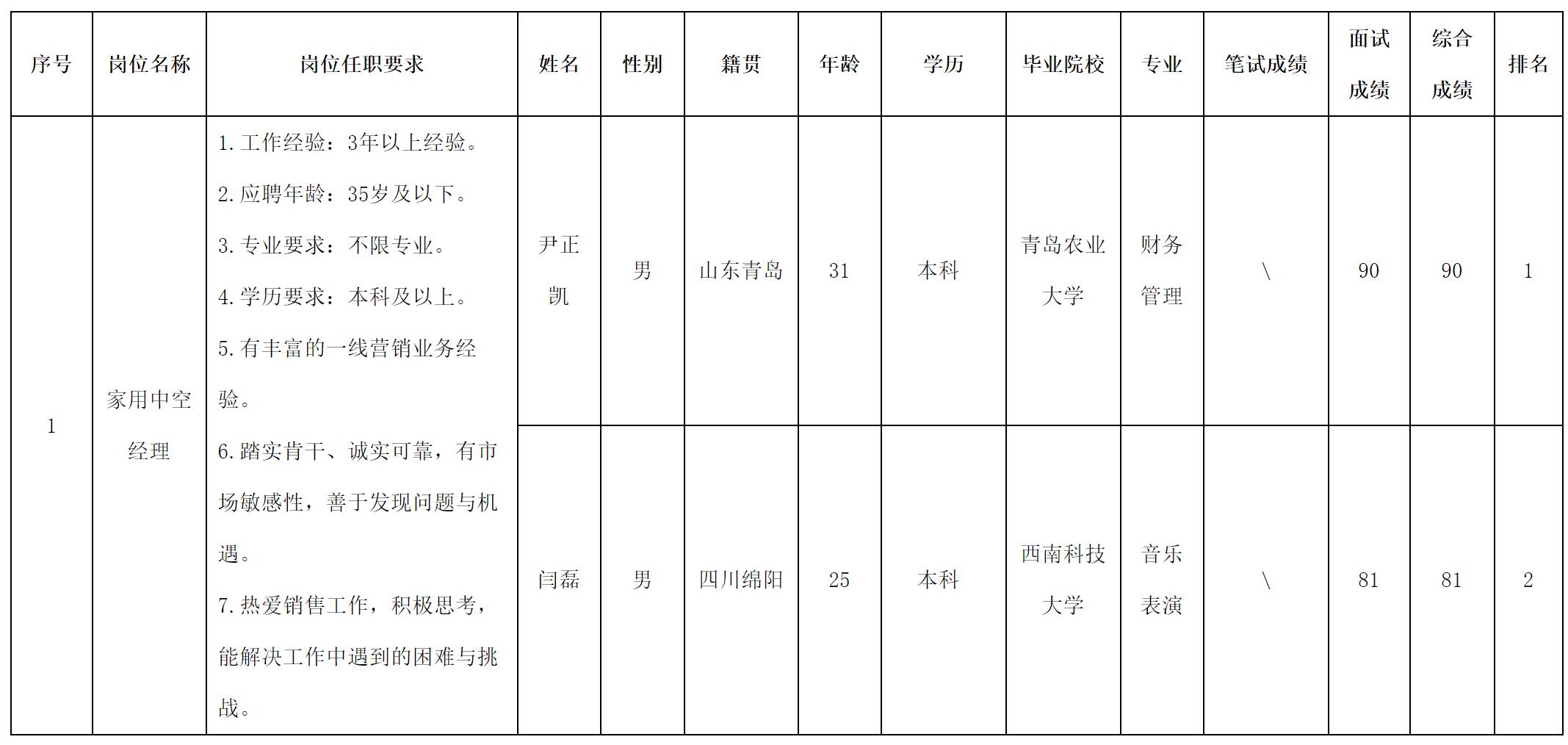 根據(jù)長(zhǎng)虹·美菱中國(guó)區(qū)營(yíng)銷(xiāo)總部發(fā)布的招聘公告及招聘相關(guān)規(guī)定,現(xiàn)將測(cè)試成績(jī)予以公示。