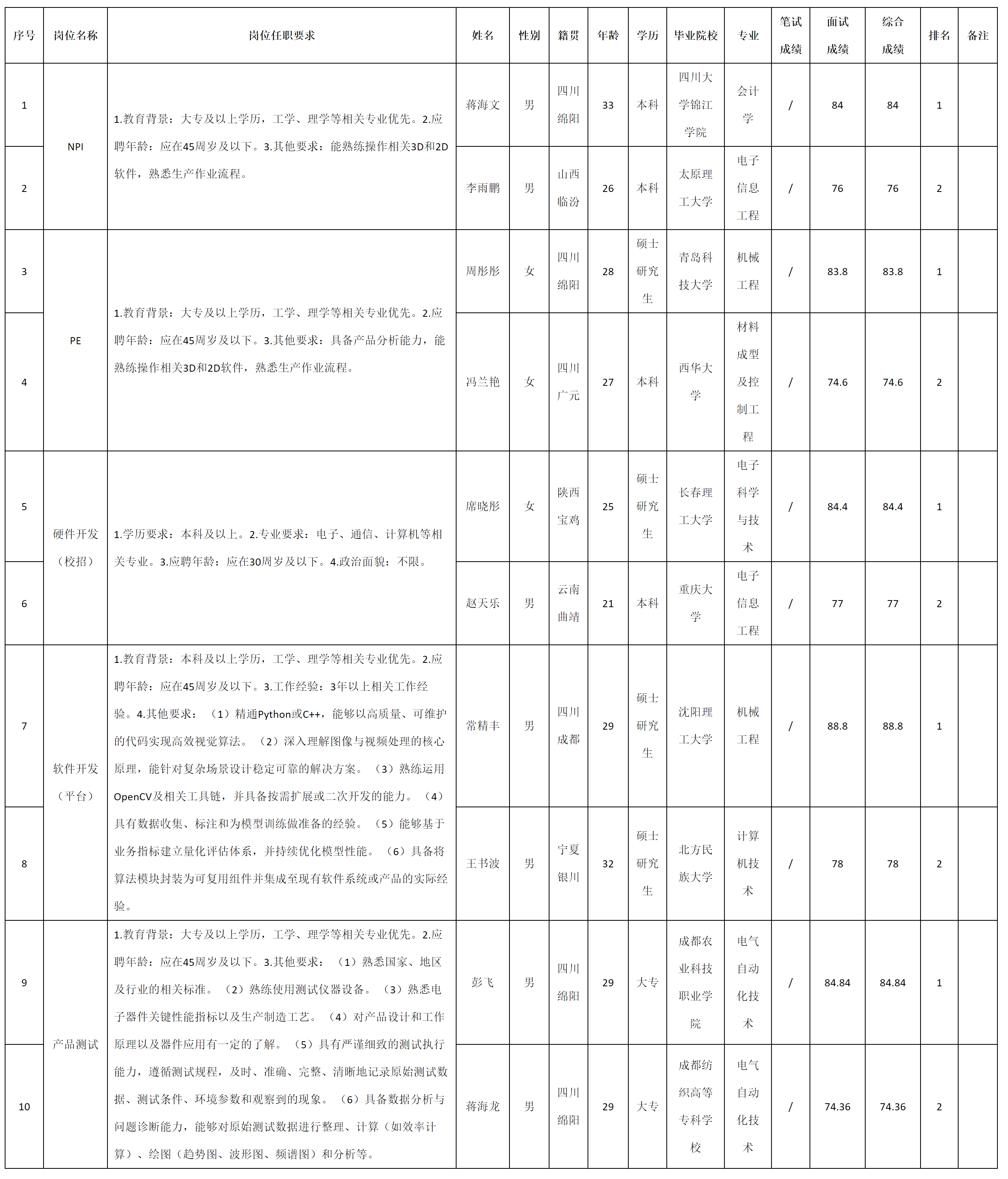 根據(jù)四川九州電子科技股份有限公司發(fā)布的招聘公告及招聘相關(guān)規(guī)定,現(xiàn)將測(cè)試成績予以公示。