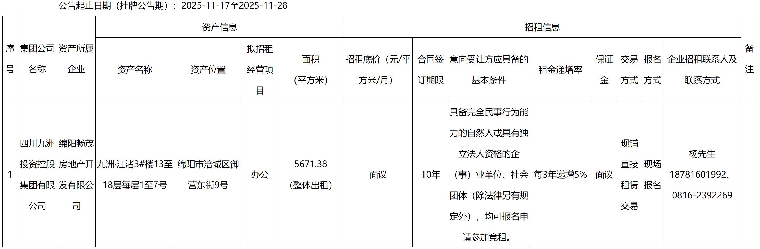 四川九洲千城商業(yè)管理有限公司涪城項(xiàng)目部九洲江渚項(xiàng)目房屋出租公告