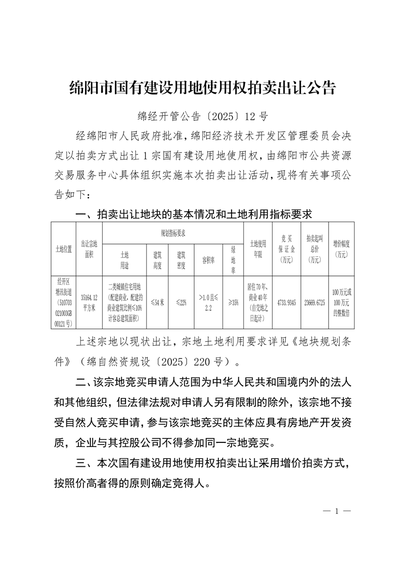 綿陽(yáng)市國(guó)有建設(shè)用地使用權(quán)拍賣出讓公告(綿經(jīng)開管公告〔2025〕12號(hào))