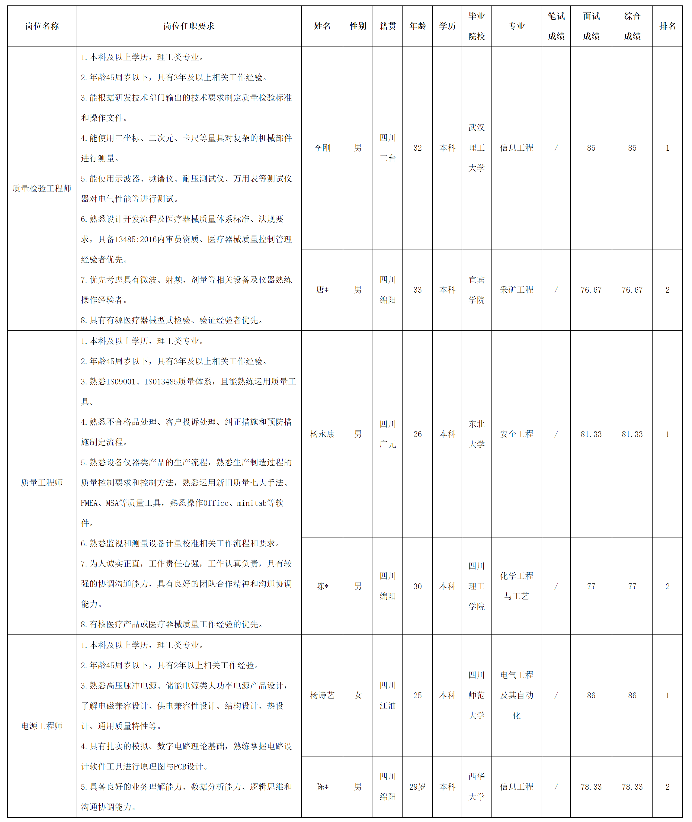 根據(jù)中玖閃光醫(yī)療科技有限公司發(fā)布的招聘公告及招聘相關(guān)規(guī)定,現(xiàn)將測(cè)試成績(jī)予以公示。