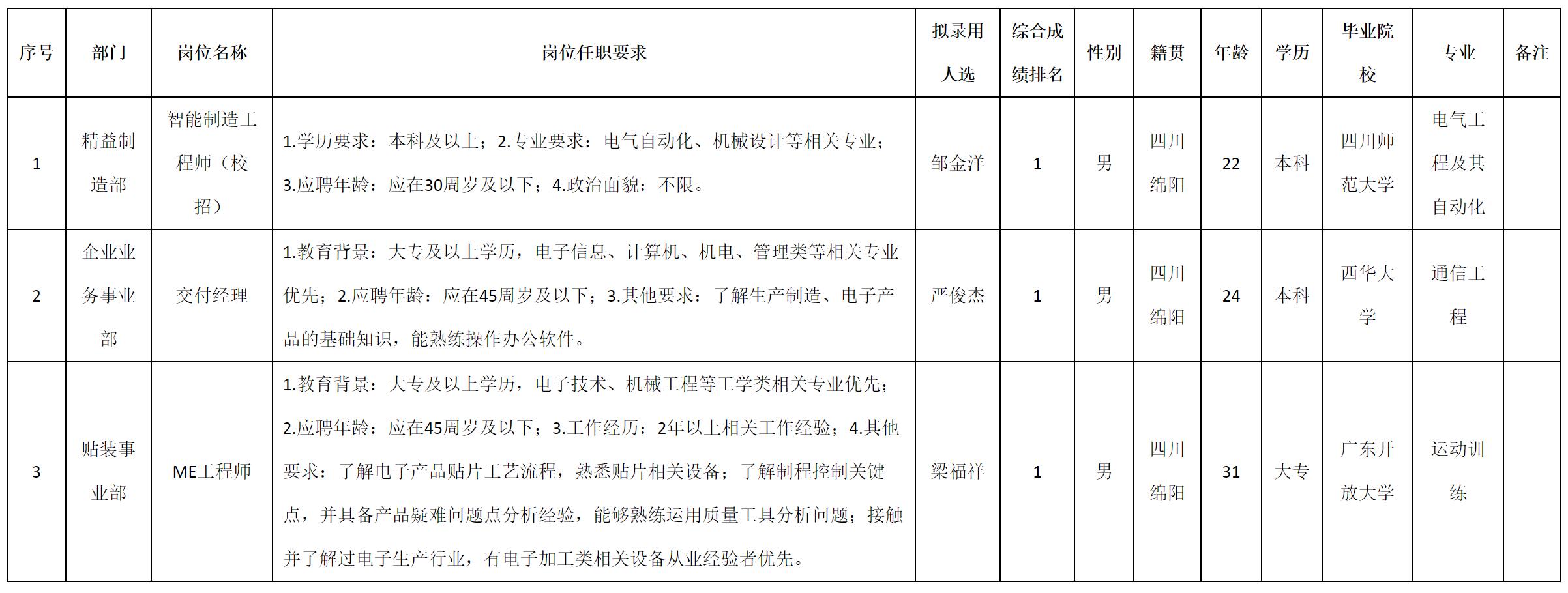 根據四川九州電子科技股份有限公司發(fā)布的招聘公告及招聘相關規(guī)定,經測試、考察、體檢等程序,擬錄用鄒金洋等3名同志到四川九州電子科技股份有限公司工作,現予以公示,具體情況如下: