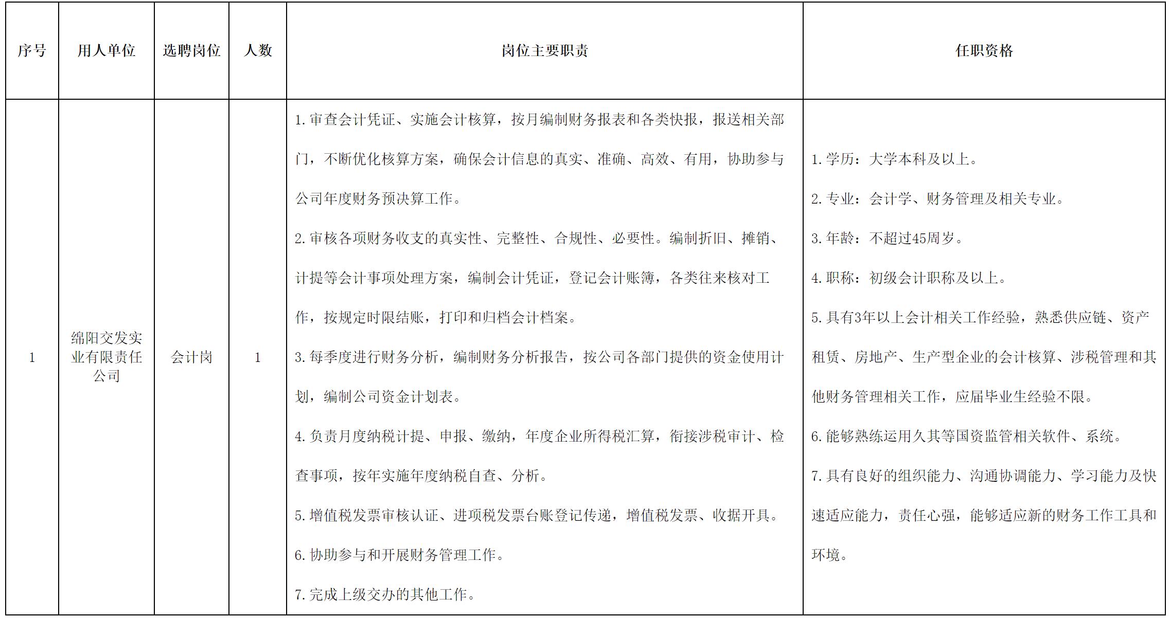 招聘信息將在綿陽市國(guó)資委、綿陽交通發(fā)展集團(tuán)有限責(zé)任公司官網(wǎng)、綿陽交發(fā)實(shí)業(yè)有限責(zé)任公司官網(wǎng)發(fā)布。