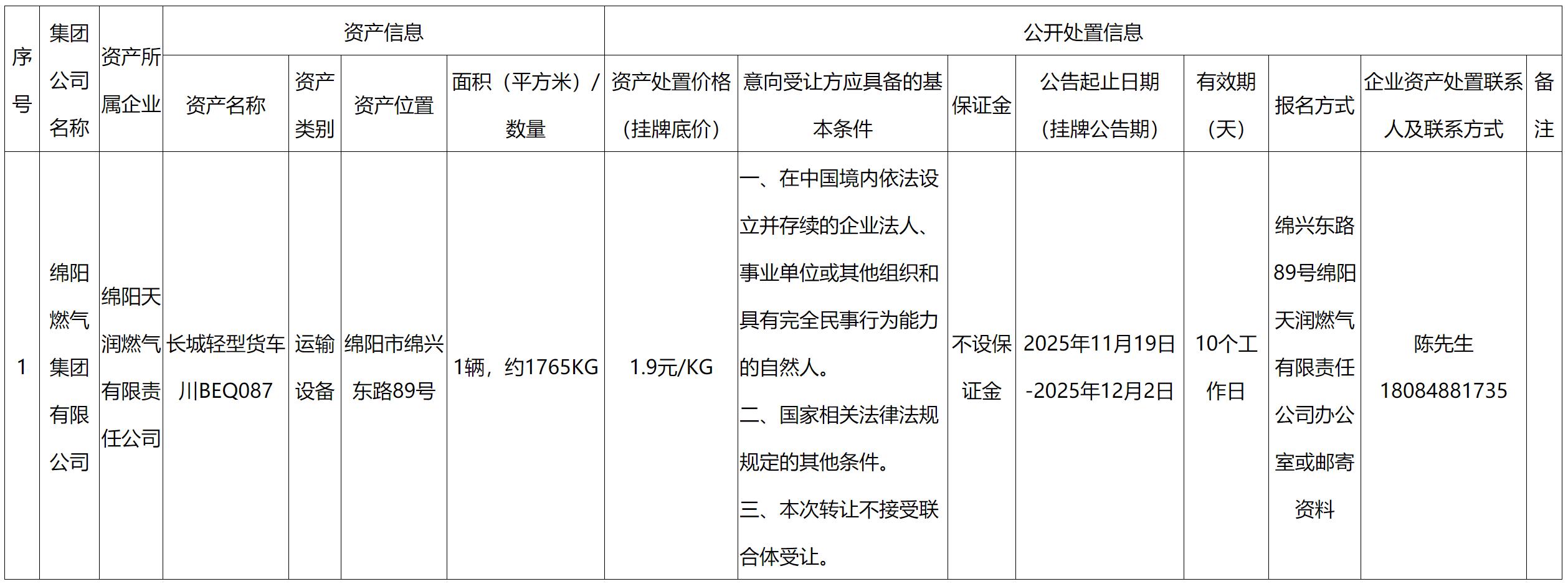 綿陽天潤燃?xì)庥邢挢?zé)任公司資產(chǎn)處置公告