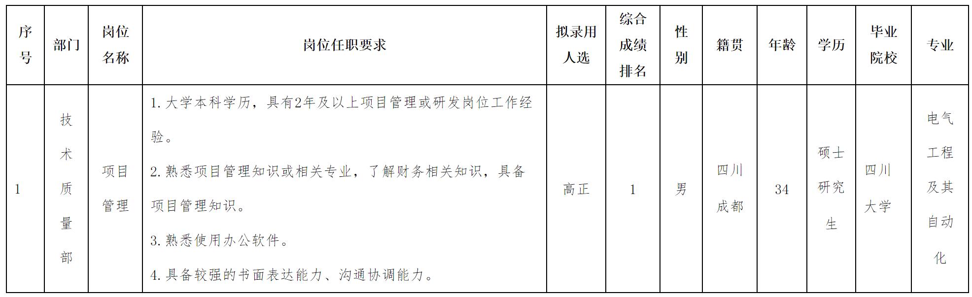 根據(jù)四川華豐科技股份有限公司發(fā)布的招聘公告及招聘相關(guān)規(guī)定,經(jīng)測試等程序,擬錄用高正同志到四川華豐科技股份有限公司工作,現(xiàn)予以公示,具體情況如下: