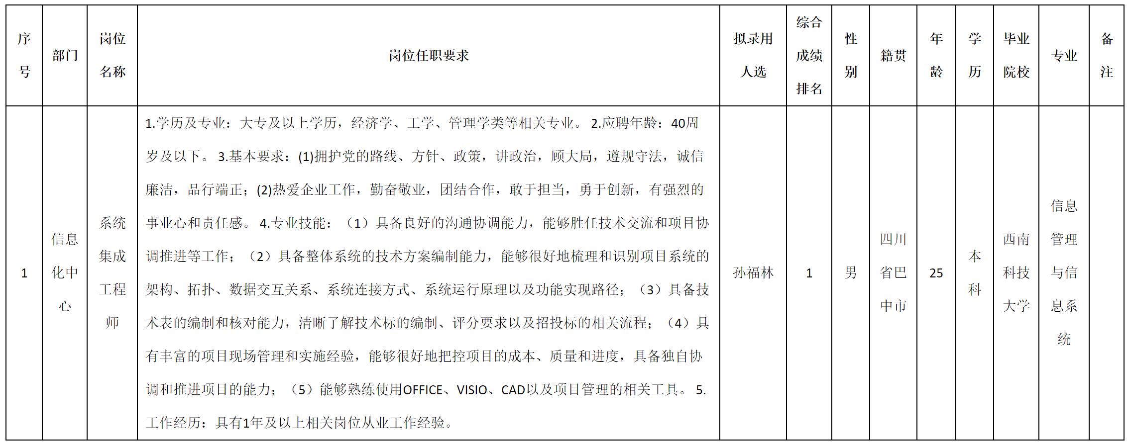 根據(jù)四川九強(qiáng)通信科技有限公司發(fā)布的招聘公告及招聘相關(guān)規(guī)定,經(jīng)測試、考察、體檢等程序,擬錄用孫福林同志到四川九強(qiáng)通信科技有限公司工作,現(xiàn)予以公示,具體情況如下: