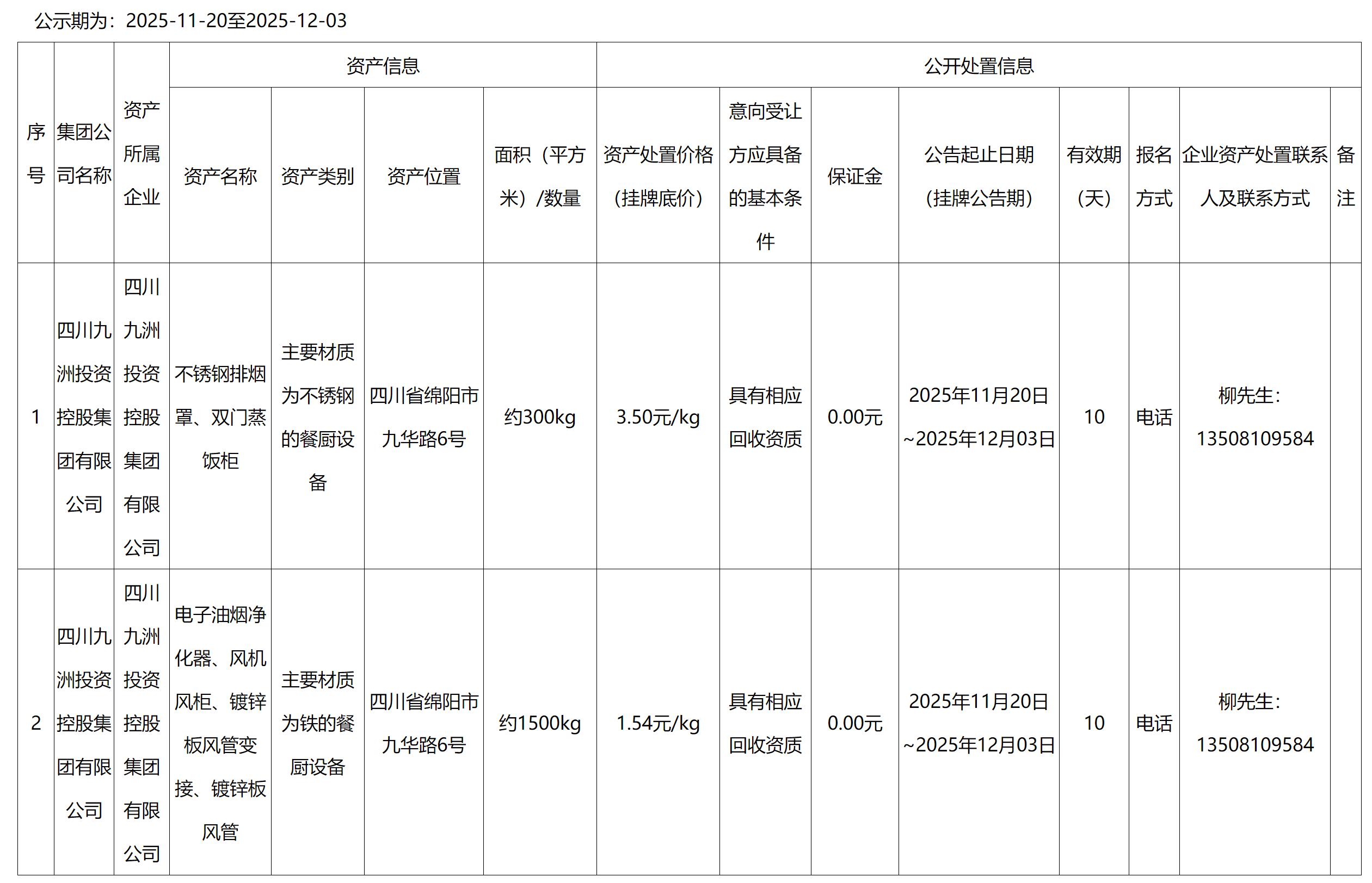 四川九洲投資控股集團(tuán)有限公司不銹鋼排煙罩等資產(chǎn)處置公告