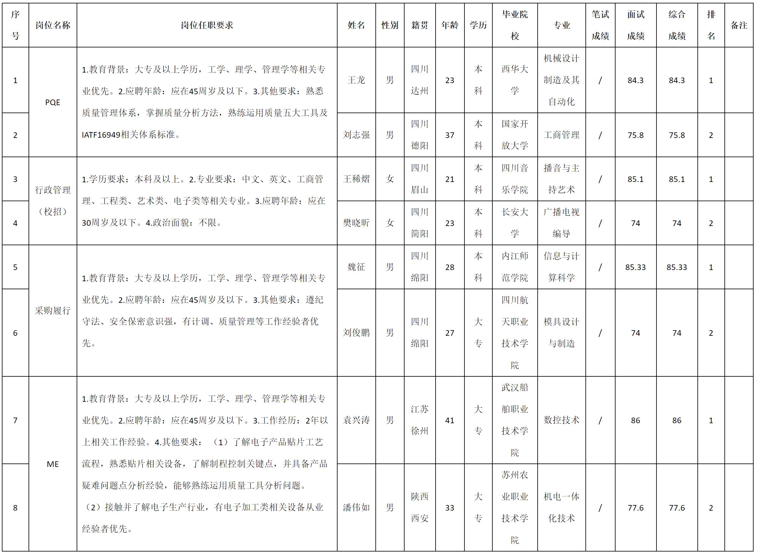 根據(jù)四川九州電子科技股份有限公司發(fā)布的招聘公告及招聘相關(guān)規(guī)定,現(xiàn)將測(cè)試成績(jī)予以公示。