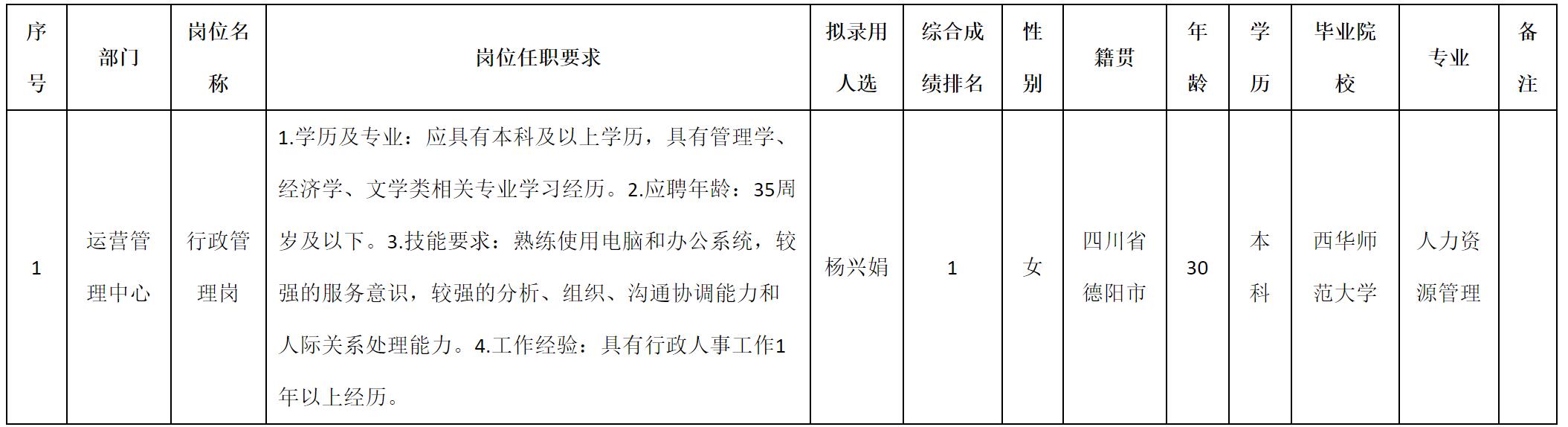 根據(jù)四川九州光電子技術(shù)有限公司發(fā)布的招聘公告及招聘相關(guān)規(guī)定,經(jīng)測試、考察、體檢等程序,擬錄用楊興娟同志到四川九州光電子技術(shù)有限公司工作,現(xiàn)予以公示,具體情況如下: