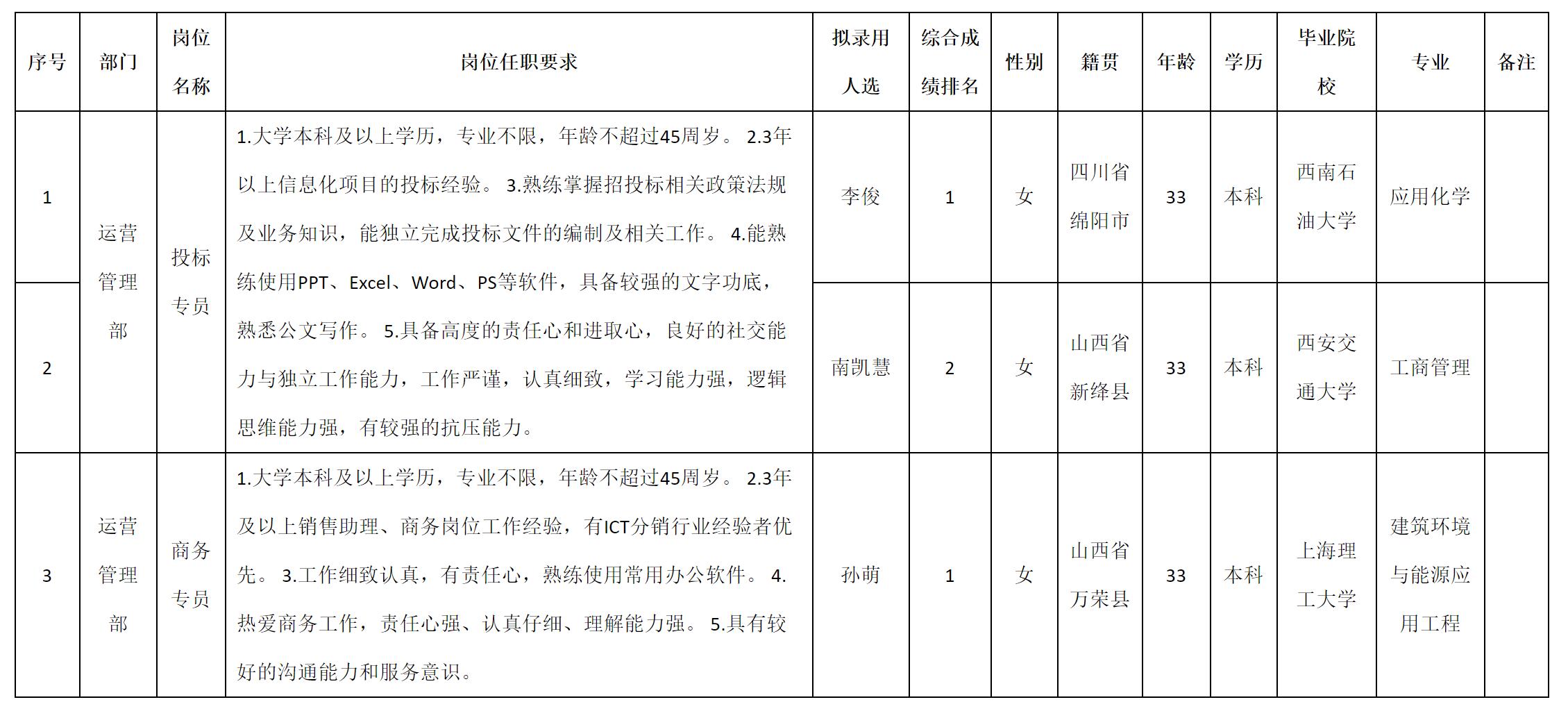 根據(jù)四川科瑞軟件有限責任公司發(fā)布的招聘公告及招聘相關(guān)規(guī)定,經(jīng)測試、考察、體檢等程序,擬錄用李俊等3名同志到四川科瑞軟件有限責任公司工作,現(xiàn)予以公示,具體情況如下: