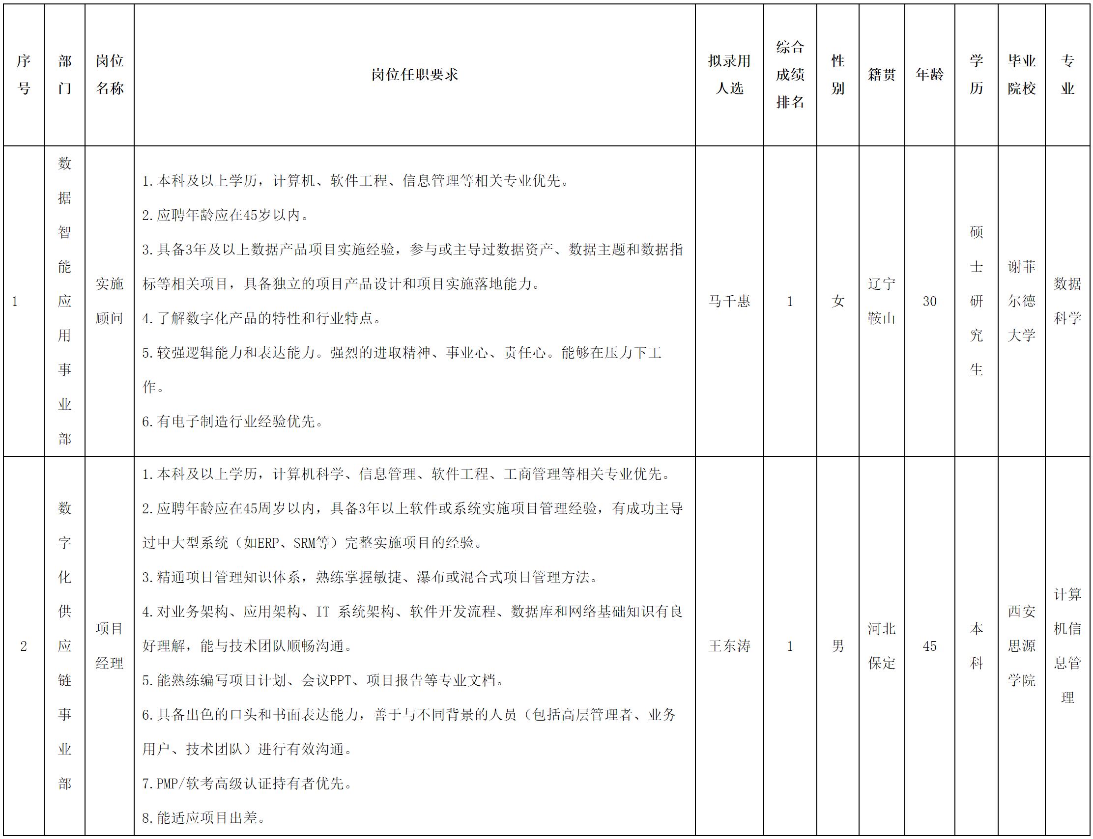 根據(jù)四川虹信軟件股份有限公司發(fā)布的招聘公告及招聘相關(guān)規(guī)定,經(jīng)測試、考察、體檢等程序,擬錄用馬千惠、王東濤同志到四川虹信軟件股份有限公司工作,現(xiàn)予以公示,具體情況如下: