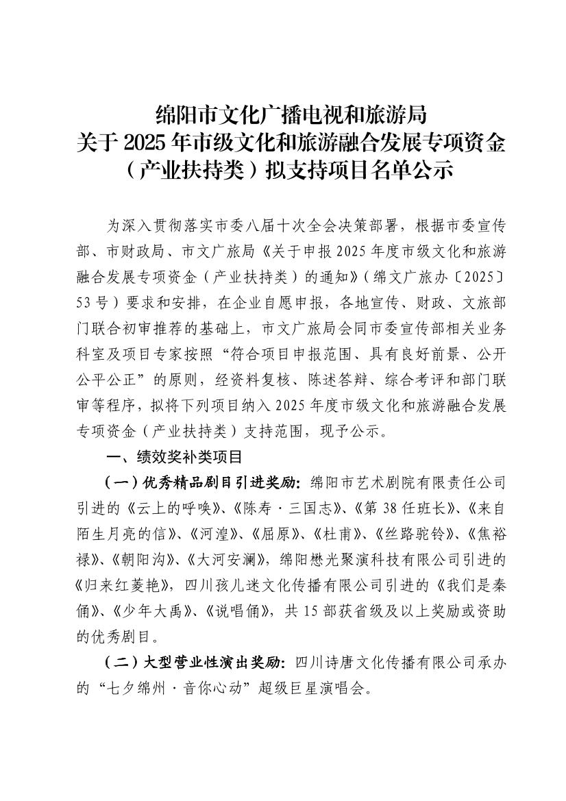 綿陽(yáng)市文化廣播電視和旅游局 關(guān)于2025年市級(jí)文化和旅游融合發(fā)展專項(xiàng)資金(產(chǎn)業(yè)扶持類)擬支持項(xiàng)目名單公示