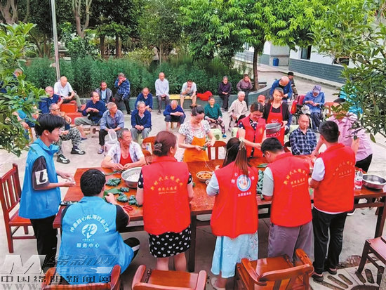 梓潼縣瑪瑙鎮(zhèn)志愿者為敬老院老人送餐包粽子。記者 劉曉東 攝