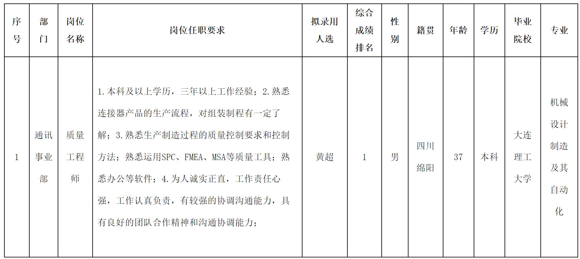 根據(jù)四川華豐科技股份有限公司發(fā)布的招聘公告及招聘相關(guān)規(guī)定,經(jīng)測(cè)試等程序,擬錄用黃超等同志到四川華豐科技股份有限公司工作,現(xiàn)予以公示,具體情況如下: