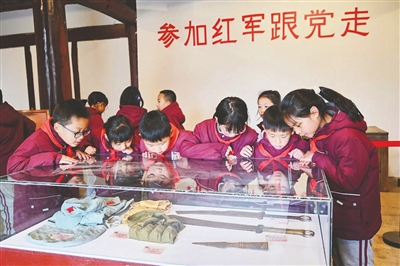學(xué)生瞻仰梓潼縣許州紅軍革命歷史紀(jì)念館烈士遺物。
