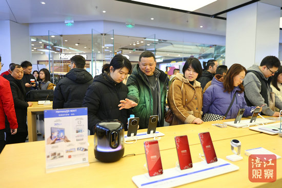 市民趙紫維帶著媽媽逛了幾家手機(jī)店后,最后決定入手國(guó)產(chǎn)手機(jī)華為。“我媽媽手機(jī)用的年限比較久了,就想換一個(gè)新的,趁著過(guò)年,我們一起來(lái)選購(gòu)一下。剛好又知道有這個(gè)國(guó)補(bǔ)政策,就想趁機(jī)會(huì)買了。”趙紫維說(shuō),剛下單的手機(jī)原本售價(jià)5499元,補(bǔ)貼之后需付4999元,省了500元,很開心。