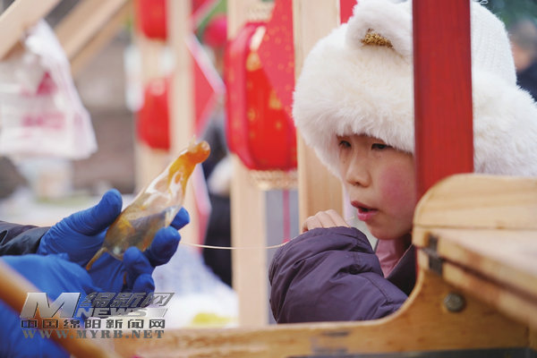 在潼川古城南外街的一家糖畫小攤邊,孩子們正認(rèn)真挑選著喜歡的圖案,完成后的糖畫在陽(yáng)光照耀下晶瑩剔透、閃閃發(fā)光。老板劉云一邊繪制著蛇形圖案的糖畫,一邊介紹:“今年是蛇年,所以買蛇形圖案糖畫的顧客特別多,這幾天生意很好,一天能賣五六百元。”