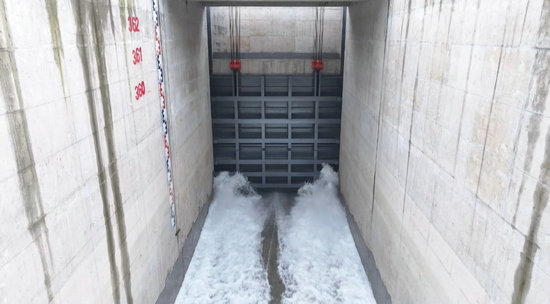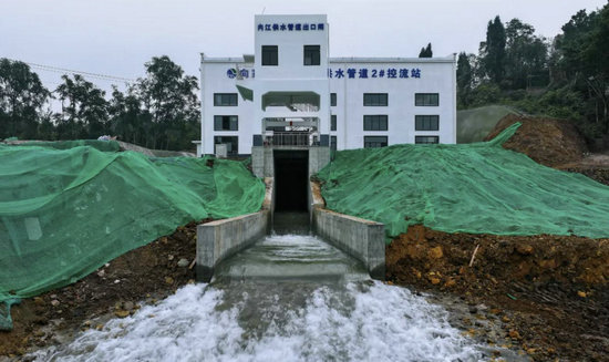 岷江江底隧洞閘門開啟后,清澈的金沙江水沿著渠道奔流而下。