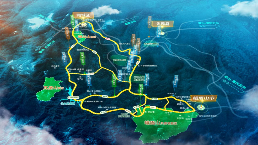 大峨眉“三山旅游環(huán)線(xiàn)”以串聯(lián)“佛國(guó)仙山”峨眉山、“最美桌山”瓦屋山、“文化名山”周公山三座名山而命名,地跨樂(lè)山、眉山、雅安三市,由G351、S104、X084等多條普通公路組成,總里程約333公里。沿線(xiàn)旅游資源優(yōu)質(zhì)豐富,不僅有世界級(jí)文旅資源“峨眉山—樂(lè)山大佛”、還有中國(guó)森林氧吧瓦屋山以及周公山、柳江古鎮(zhèn)、七里坪等旅游度假區(qū)。