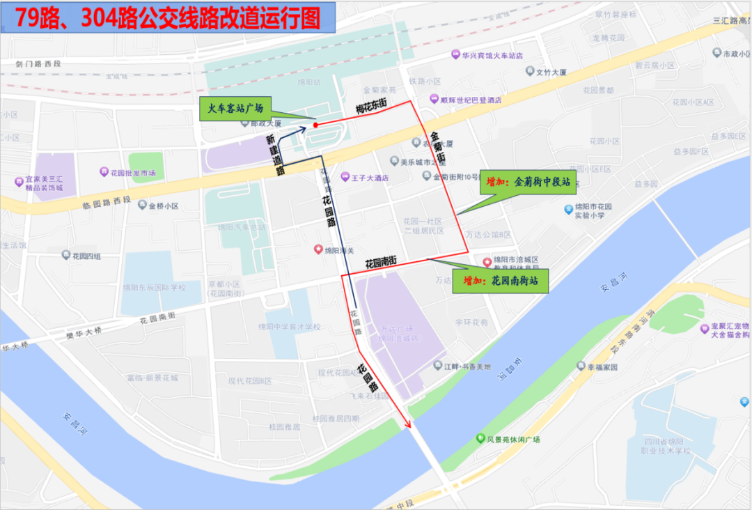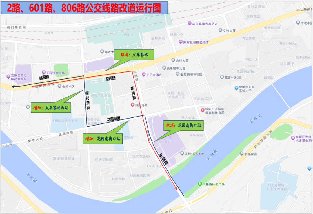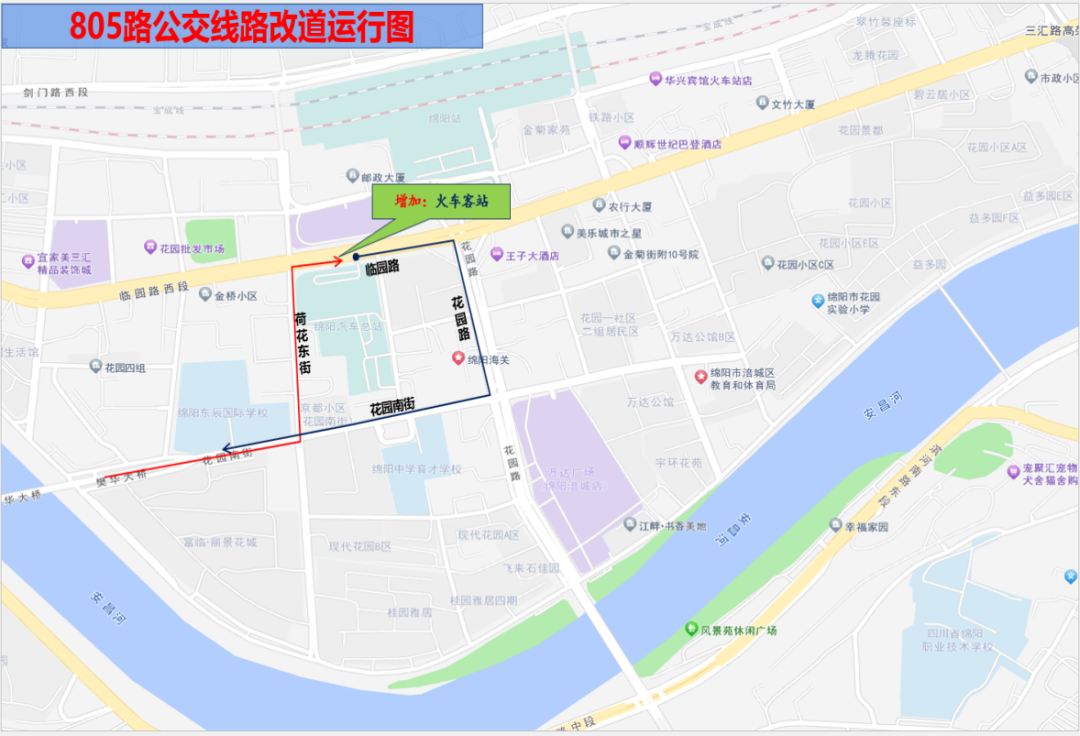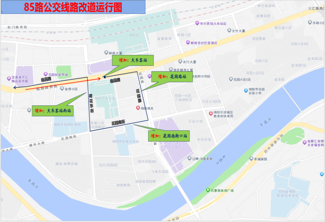 長虹智能產業(yè)園—火車客站(改道后)。開往火車客站方向,行至荷花東街??炕疖嚳驼疚髡竞?,改道經臨園路至火車客站(汽車總站側);返回經花園路至花園南街回原線路運行。