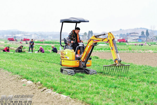 村民正在用采挖機收割麥冬。(記者王勇攝)