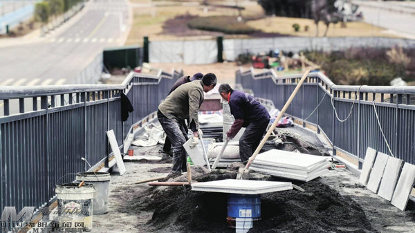 工人正在進行跨越108國道人行天橋地磚鋪設