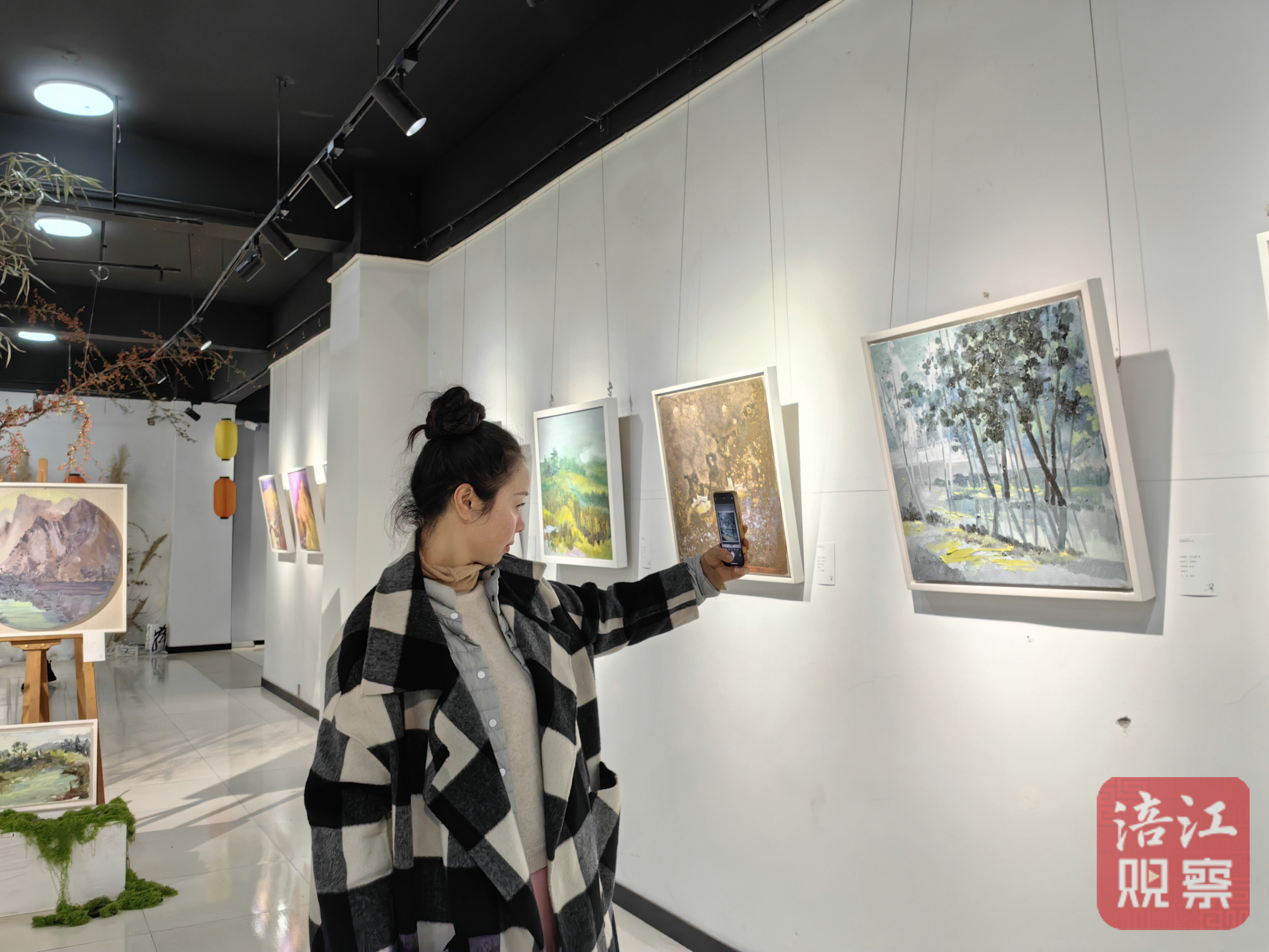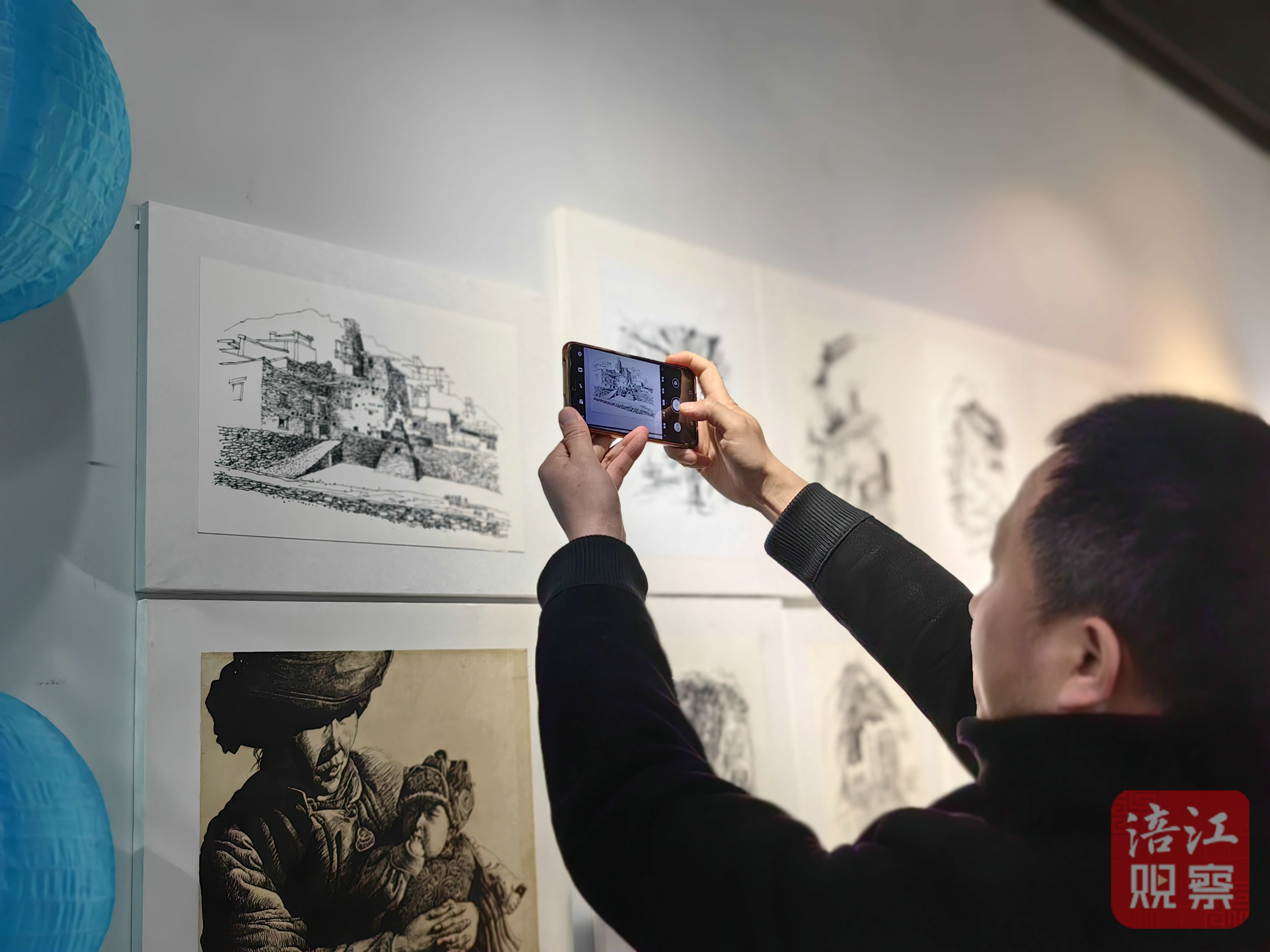 在展覽現(xiàn)場(chǎng),不少參觀者一邊欣賞一邊拿出手機(jī)拍攝,有的對(duì)展出作品所呈現(xiàn)的內(nèi)容、蘊(yùn)含的藝術(shù)價(jià)值、人文情懷進(jìn)行探討。
