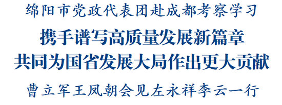曹立軍、王鳳朝代表成都市委、市政府對綿陽市黨政代表團一行來蓉考察表示歡迎,向綿陽一直以來對成都經(jīng)濟社會發(fā)展的支持幫助表示感謝。曹立軍說,當前成都正深入學(xué)習(xí)貫徹習(xí)近平總書記對四川工作系列重要指示精神,積極搶抓新時代西部大開發(fā)、成渝地區(qū)雙城經(jīng)濟圈建設(shè)等重大戰(zhàn)略機遇,認真落實省委研究支持成都市高質(zhì)量發(fā)展專題會議部署要求,全力以赴拼經(jīng)濟、搞建設(shè),加快建設(shè)西部經(jīng)濟中心、科技創(chuàng)新中心、對外交往中心和全國先進制造業(yè)基地,全面建設(shè)踐行新發(fā)展理念的公園城市示范區(qū)。成都與綿陽地緣相近、人緣相親、交往頻繁,近年來兩地在科技創(chuàng)新、產(chǎn)業(yè)發(fā)展、社會治理、民生改善等領(lǐng)域取得了一系列務(wù)實有效的合作成果。作為全省和成渝地區(qū)重要城市,成綿兩地持續(xù)深化協(xié)同聯(lián)動,既是發(fā)展所需、也是使命所在。希望雙方在共同服務(wù)國家重大戰(zhàn)略、強化科創(chuàng)資源對接轉(zhuǎn)化、推動基礎(chǔ)設(shè)施互聯(lián)互通、促進公共服務(wù)普惠共享等方面加強協(xié)同合作,共同為奮力譜寫中國式現(xiàn)代化四川新篇章貢獻更大力量。