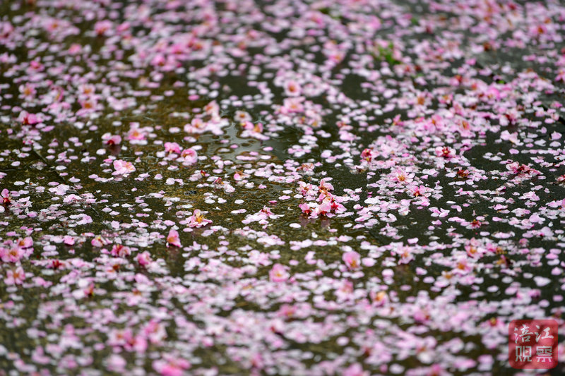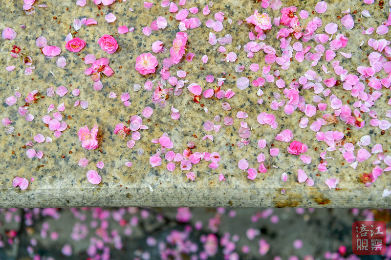 春雨不經(jīng)意打落了一樹梅花,粉色的花瓣緩緩飄落,為這幅春日畫卷增添了幾分詩意與浪漫。