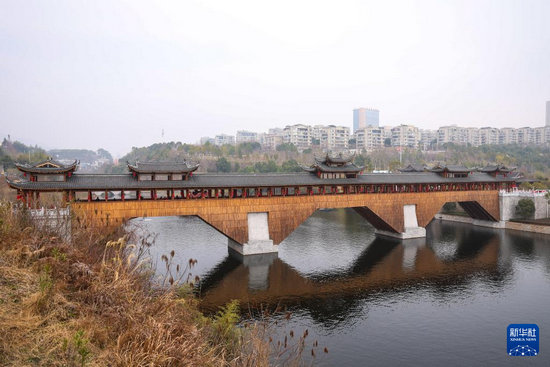 這是2月25日在浙江省溫州市泰順縣拍攝的使用中國(guó)木拱橋傳統(tǒng)營(yíng)造技藝新建的廊橋——如意橋。
