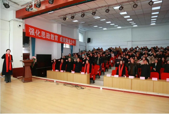 在校長胥艷的帶領(lǐng)下,與會干部、全體2022級初三畢業(yè)班教師集體舉行了宣誓儀式。