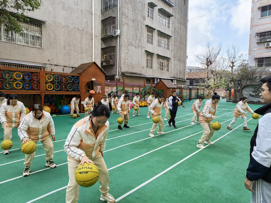 在實(shí)操環(huán)節(jié),教師們從基礎(chǔ)動(dòng)作到進(jìn)階技能逐項(xiàng)突破。依次進(jìn)行了單手拍、左右手交替拍、雙手拍球、行進(jìn)間運(yùn)球等動(dòng)作技能的學(xué)習(xí),同時(shí)現(xiàn)場(chǎng)模擬幼兒課堂場(chǎng)景,分組設(shè)計(jì)“籃球主題游戲方案”,融合故事、音樂、跨學(xué)科元素,探索“玩中學(xué)”的創(chuàng)新路徑。