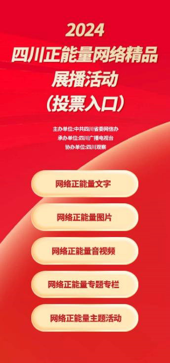 由四川省委網(wǎng)信辦主辦的2024四川正能量網(wǎng)絡(luò)精品征集展播活動和投票活動已正式開啟。本次征集活動分為媒體組和融合組兩個類別,按照網(wǎng)絡(luò)正能量文字、圖片、音視頻、專題專欄、主題活動等五個賽道進行優(yōu)秀作品征集,挖掘和傳播四川各地的正能量故事,展現(xiàn)新時代四川人民的精神風貌。
