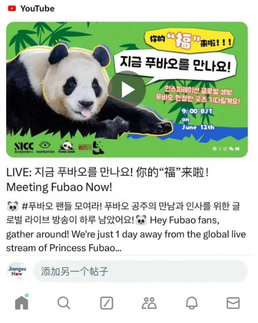 6月12日,迎接“福寶”的首次公開亮相,韓國站姐、日本站哥不遠千里來到四川,更有暫時無法“奔現(xiàn)”的大批韓國網(wǎng)友在全球直播間持續(xù)刷屏,近20萬網(wǎng)友為“福寶”送上祝福。韓國網(wǎng)友“Hjjoo”表示“我從來沒想過我這輩子會如此想去中國??”,網(wǎng)友“GretchenMae”瘋狂表白“全世界都愛‘福寶’!”。一些高校傳播專業(yè)還將此案例作為生活教材進行深入解讀。