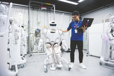 2024年6月26日,在深圳市優(yōu)必選科技股份有限公司總部,工作人員對人形機(jī)器人WalkerX進(jìn)行測試。(新華社發(fā))