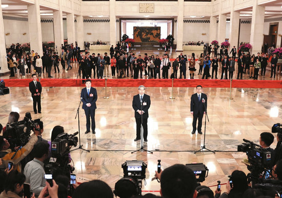 3月4日,全國政協(xié)十四屆三次會議首場“委員通道”集體采訪活動在北京人民大會堂舉行。(新華社記者 張玉薇 攝)