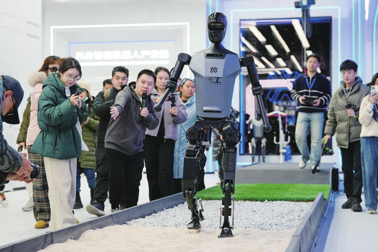 在北京“機(jī)器人大世界”,參觀者在參觀人形機(jī)器人“天工”的行進(jìn)展示(2月24日攝)。(新華社記者 鞠煥宗 攝)