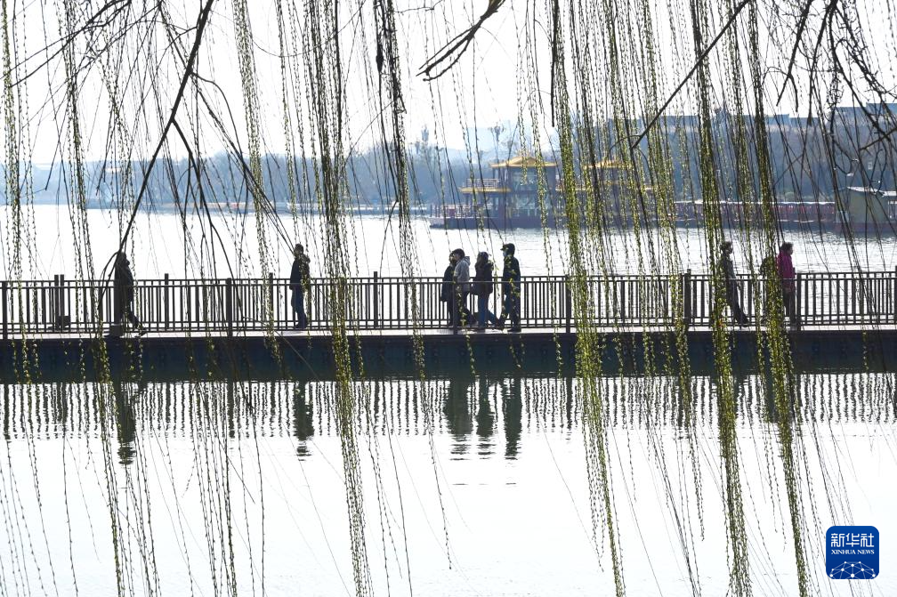 3月6日,游人在河南省開封市龍亭西湖棧道上游覽。