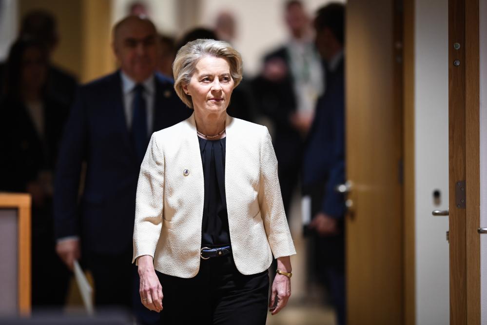 2025年3月6日,在比利時布魯塞爾,歐盟委員會主席馮德萊恩在歐盟特別峰會上。新華社記者彭子洋攝