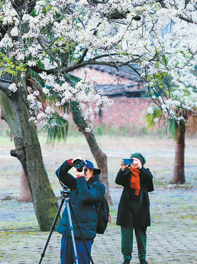 甲宅村桃花巖景區(qū)內(nèi),盛放的梨花吸引游客拍照觀賞。秦艷濤攝