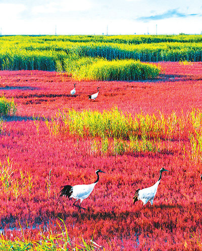 在盤錦遼河口濕地,紅灘綠葦與鶴共舞,鋪展人與自然和諧共生的生態(tài)畫卷。張良軍攝(盤錦市文旅集團供圖)