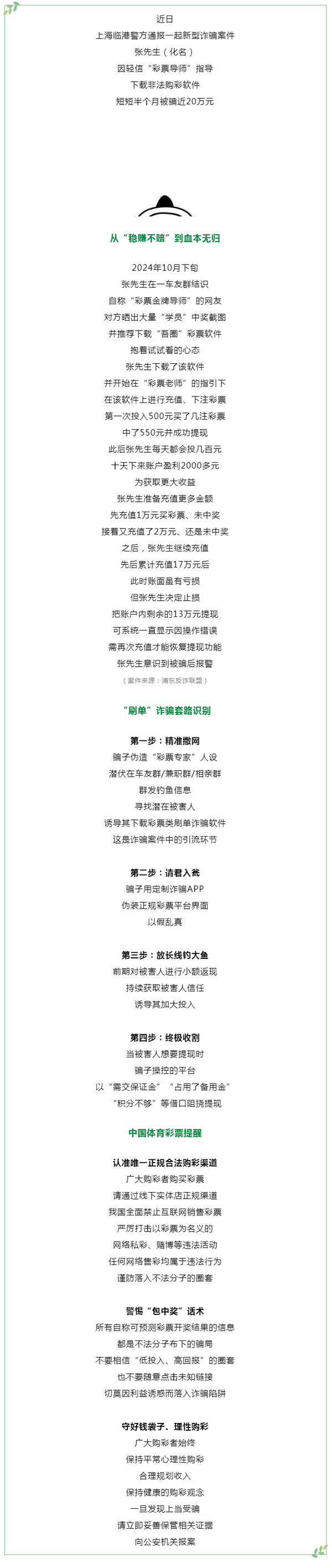 近日,上海臨港警方通報一起新型詐騙案件。張先生(化名)因輕信“彩票導(dǎo)師”指導(dǎo)下載非法購彩軟件,短短半個月被騙近20萬元。