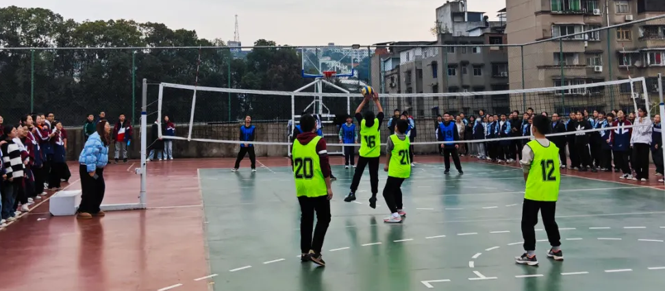 排球場上,運動員們奮力拼搏、頑強救球,展現(xiàn)出堅韌不拔的毅力和團隊協(xié)作精神。場下的觀眾也熱情高漲,為自己班級的隊伍吶喊助威。