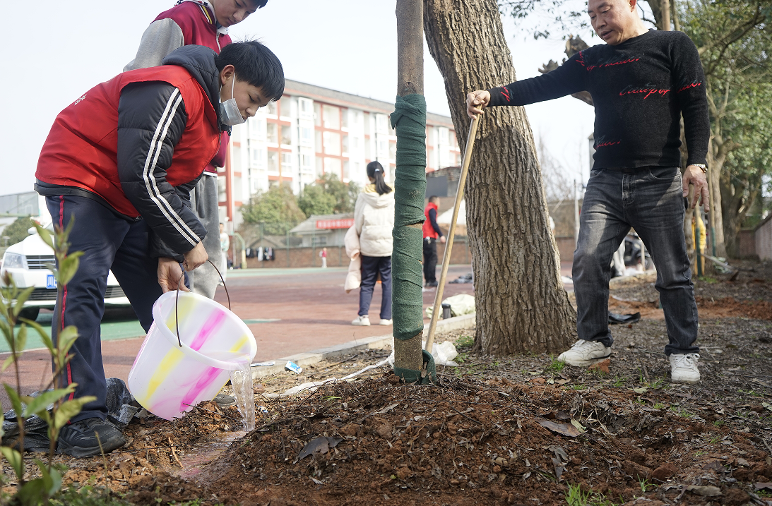 此次植樹(shù)活動(dòng)別具一格,每棵新栽種的樹(shù)苗都以班級(jí)命名,成為各班集體的象征和共同成長(zhǎng)的見(jiàn)證。學(xué)生們熱情高漲,干勁十足,有的挖坑,有的扶苗,有的培土,有的澆水,各個(gè)環(huán)節(jié)銜接有序,配合默契,現(xiàn)場(chǎng)呈現(xiàn)出一派熱火朝天的勞動(dòng)景象。經(jīng)過(guò)兩個(gè)多小時(shí)的辛勤勞動(dòng),一棵棵新栽種的樹(shù)苗迎風(fēng)挺立,為初春的校園增添了勃勃生機(jī)。