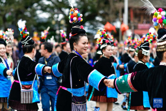 3月15日,當?shù)厝罕娫谫F州省榕江縣三寶侗寨“薩瑪節(jié)”活動中跳“多耶舞”。